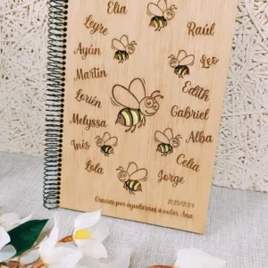 Puede ser con mariposas, colibrís, abejitas etc…solo tenéis que contarnos como os gustaría, elegir el color interior y añadir el listado de niños. Nosotros nos encargamos del resto y de que llegue a tiempo y listo para regalar.